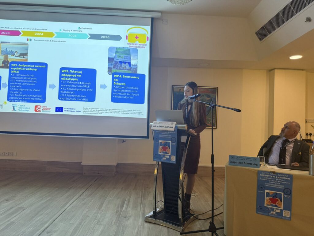 In December 2025, representing the Erasmus + research project Virtual Children’s Hospital for Learning Pediatric Nursing (VLPN), Dr Joanna Menikou — member of Cyprus University of Technology (CUT) research team — participated in the 32nd Pancyprian Conference of Nursing and Midwifery, together with Dr Koralia Michael, and Joanna Pieri, both members of the CUT research team.